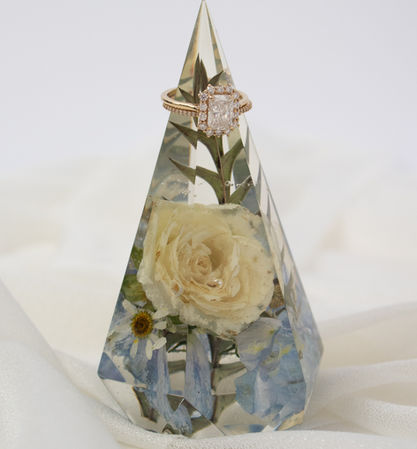 Display and keep your rings on our one-of-a-kind ring holder. The handcrafted ring tree features your real flowers preserved in clear, UV-resistant resin, turning your blooms from precious events into a functional work of art.